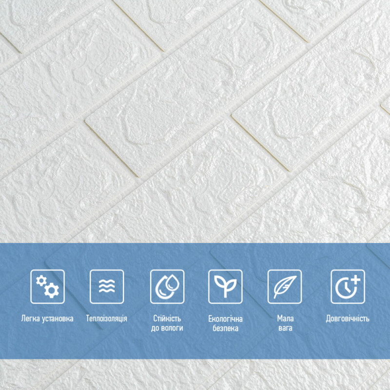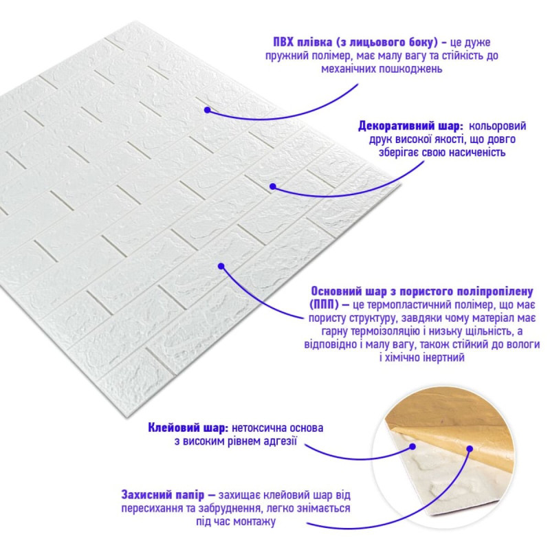 3D панелі самоклеючі – декоративне покриття для стін, виконане з легкого та міцного матеріалу – пористого поліпропілену (ППП). Основна особливість – рельєфний малюнок у вигляді цегли у широкому різноманітті кольорів та наявність клейового шару, що дозволяє встановити панелі без необхідності застосування додаткових матеріалів.
