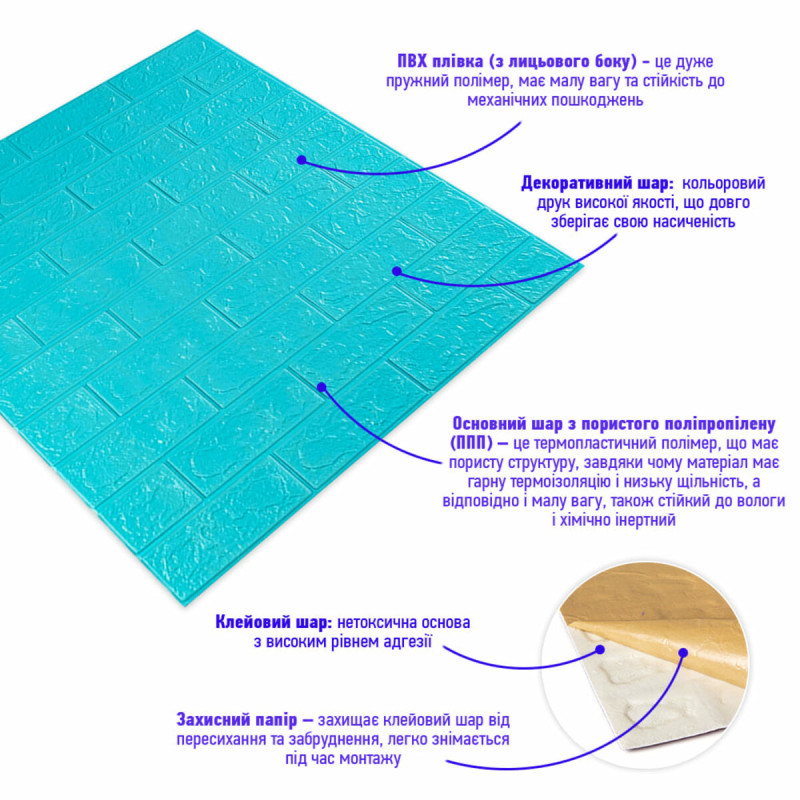 - Легкість монтажу: наявність клейового шару дозволяє встановити панелі без необхідності застосування додаткових матеріалів.