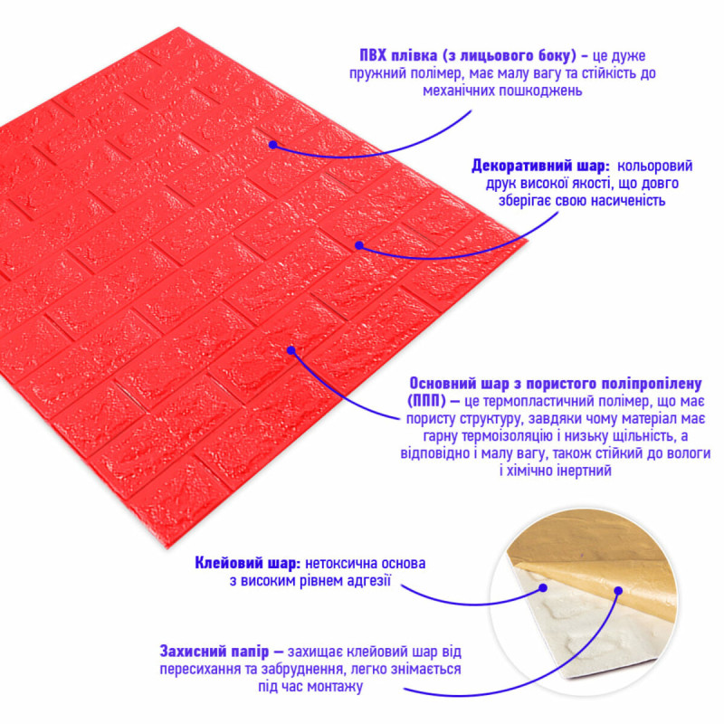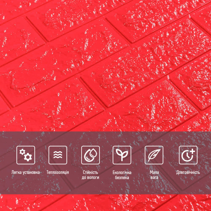 3D панелі самоклеючі – декоративне покриття для стін, виконане з легкого та міцного матеріалу – пористого поліпропілену (ППП). Основна особливість – рельєфний малюнок у вигляді цегли у широкому різноманітті кольорів та наявність клейового шару, що дозволяє встановити панелі без необхідності застосування додаткових матеріалів.