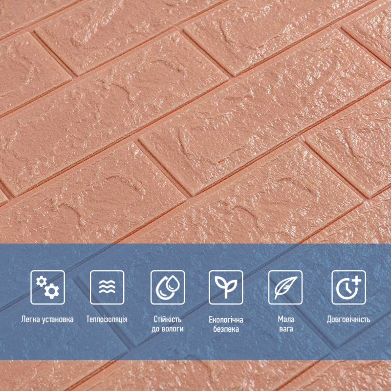 3D панелі самоклеючі – декоративне покриття для стін, виконане з легкого та міцного матеріалу – пористого поліпропілену (ППП). Основна особливість – рельєфний малюнок у вигляді цегли у широкому різноманітті кольорів та наявність клейового шару, що дозволяє встановити панелі без необхідності застосування додаткових матеріалів.