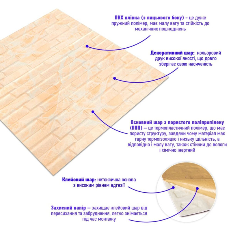 3D панелі самоклеючі – декоративне покриття для стін, виконане з легкого та міцного матеріалу – пористого поліпропілену (ППП). Основна особливість – рельєфний малюнок у вигляді цегли у широкому різноманітті кольорів та наявність клейового шару, що дозволяє встановити панелі без необхідності застосування додаткових матеріалів.