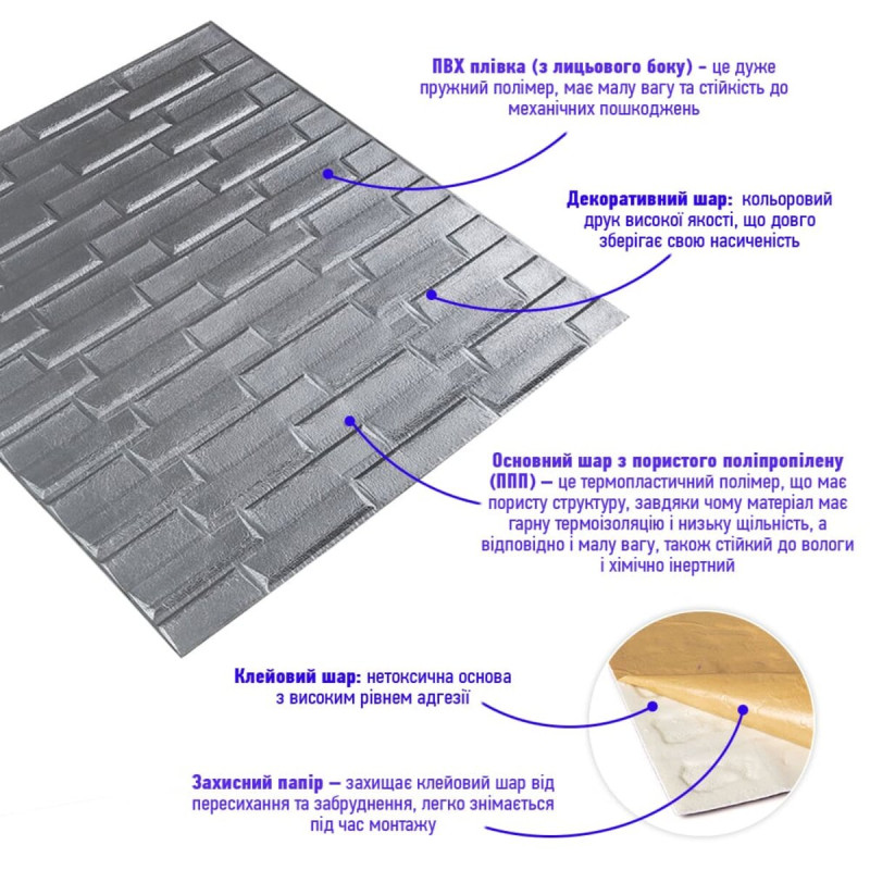3D панелі самоклеючі – декоративне покриття для стін, виконане з легкого та міцного матеріалу – пористого поліпропілену (ППП). Основна особливість – рельєфний малюнок у вигляді цегли у широкому різноманітті кольорів та наявність клейового шару, що дозволяє встановити панелі без необхідності застосування додаткових матеріалів.