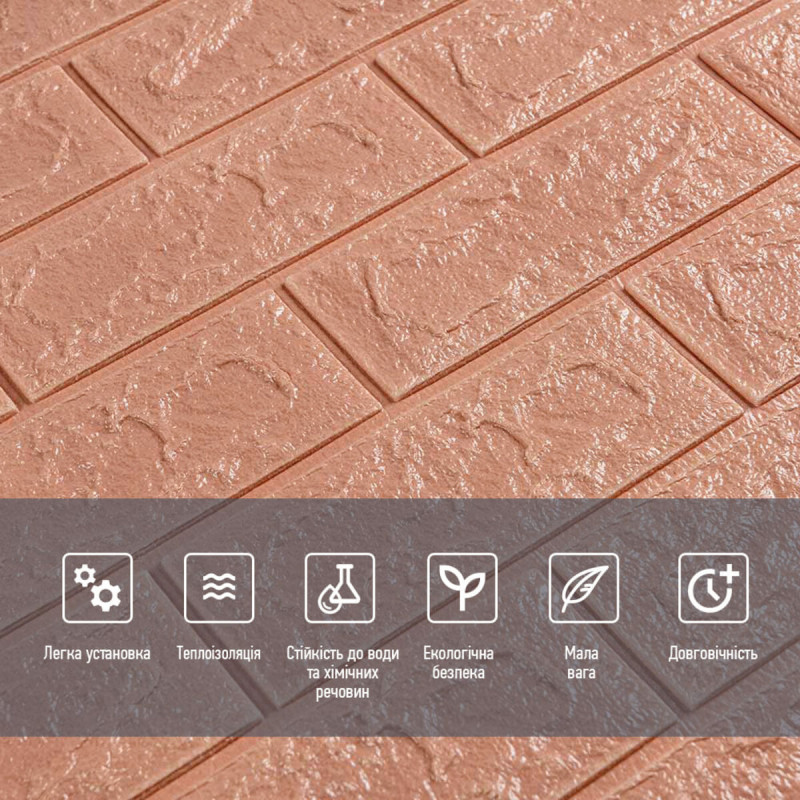 3D панелі самоклеючі – декоративне покриття для стін, виконане з легкого та міцного матеріалу – пористого поліпропілену (ППП). Основна особливість – рельєфний малюнок у вигляді цегли у широкому різноманітті кольорів та наявність клейового шару, що дозволяє встановити панелі без необхідності застосування додаткових матеріалів.