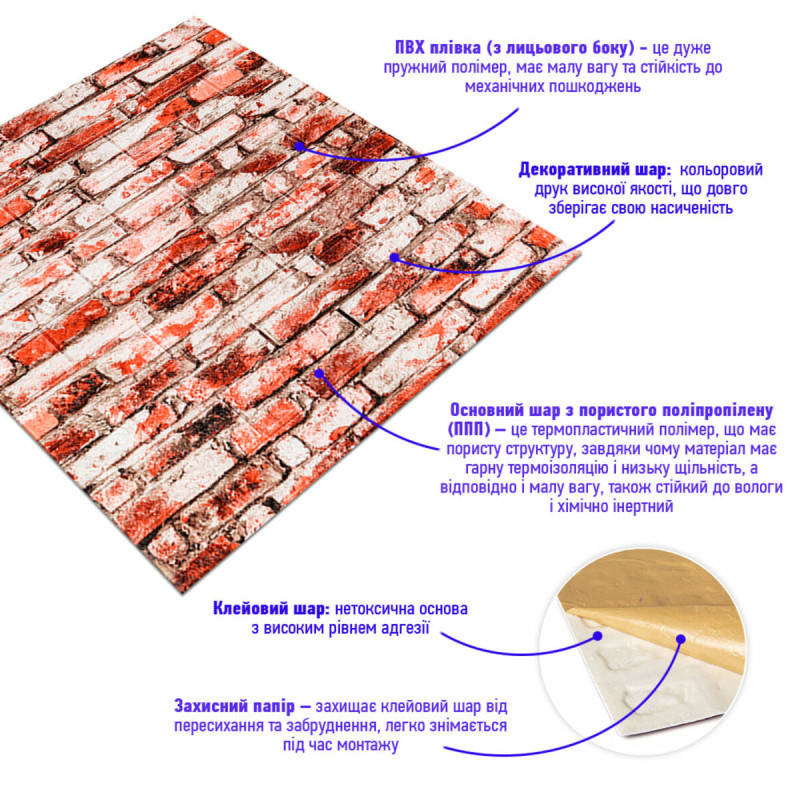 3D панелі самоклеючі – декоративне покриття для стін, виконане з легкого та міцного матеріалу – пористого поліпропілену (ППП). Основна особливість – рельєфний малюнок у вигляді цегли у широкому різноманітті кольорів та наявність клейового шару, що дозволяє встановити панелі без необхідності застосування додаткових матеріалів.