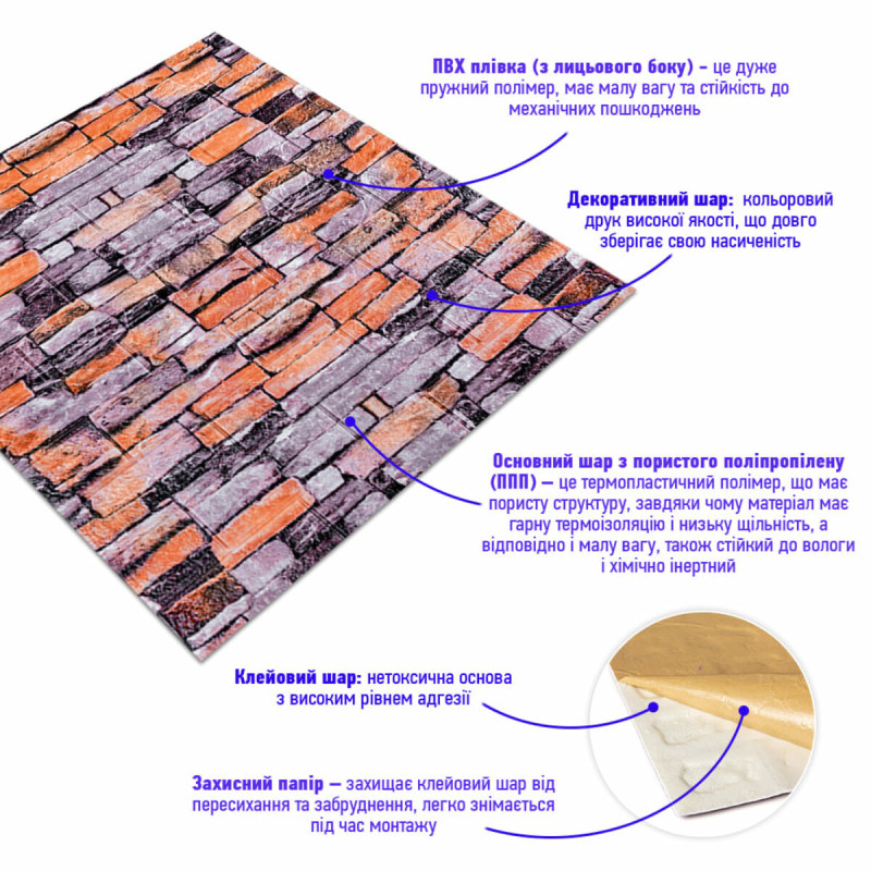 3D панелі самоклеючі – декоративне покриття для стін, виконане з легкого та міцного матеріалу – пористого поліпропілену (ППП). Основна особливість – рельєфний малюнок у вигляді цегли у широкому різноманітті кольорів та наявність клейового шару, що дозволяє встановити панелі без необхідності застосування додаткових матеріалів.
