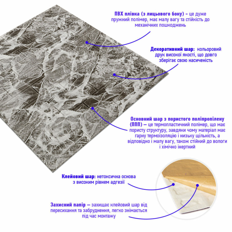 3. Легкість монтажу: наявність клейового шару дозволяє встановити панелі без необхідності застосування додаткових матеріалів.