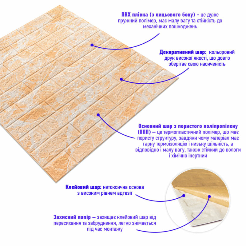- Легкість монтажу: наявність клейового шару дозволяє встановити панелі без необхідності застосування додаткових матеріалів.