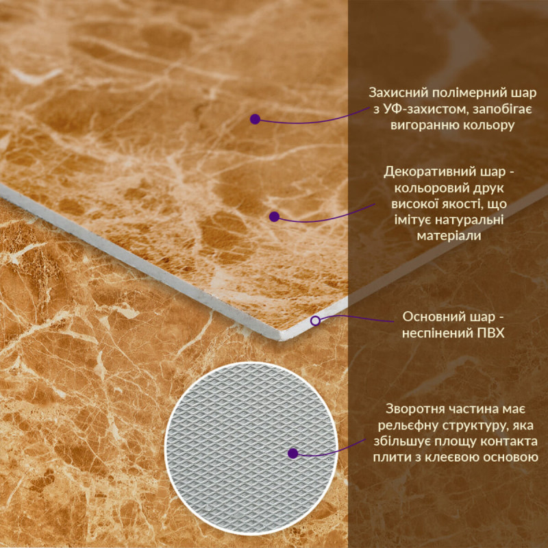 Розмір ПВХ плити - 600ммх600мм. Товщина - 3 мм. Вага листа - 2,4кг