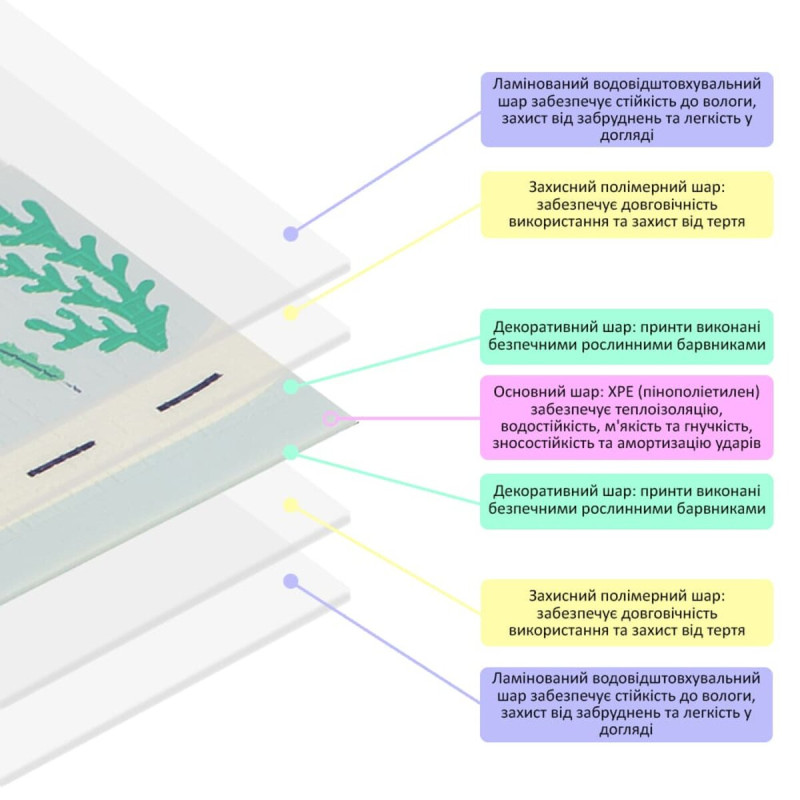 Основний матеріал килимка – спінений поліуретан (ХРЕ). Цей матеріал широко застосовується, він має термоізоляційний ефект, тобто не пропускає холод, а також не викликає алергію. Верхнє покриття килимка - харчова плівка, яка робить килимок вологостійким і захищає малюнок від зносу.