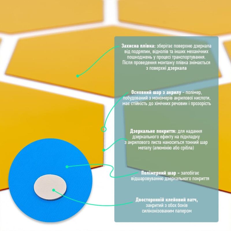 - Дзеркальний шар: це тонке металізоване або полімерне покриття, яке наноситься на акрилову основу та створює ефект дзеркального відбиття. Воно має гладку, світловідбивну поверхню, стійку до вологи та зношування. Завдяки гнучкості матеріалу відображення може незначно викривлюватися.