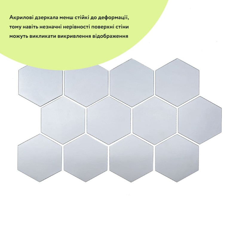 - Дзеркальний шар: це тонке металізоване або полімерне покриття, яке наноситься на акрилову основу та створює ефект дзеркального відбиття. Воно має гладку, світловідбивну поверхню, стійку до вологи та зношування. Завдяки гнучкості матеріалу відображення може незначно викривлюватися.