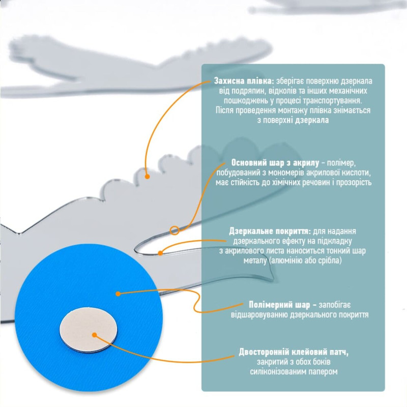 - Дзеркальний шар: це тонке металізоване або полімерне покриття, яке наноситься на акрилову основу та створює ефект дзеркального відбиття. Воно має гладку, світловідбивну поверхню, стійку до вологи та зношування. Завдяки гнучкості матеріалу відображення може незначно викривлюватися.