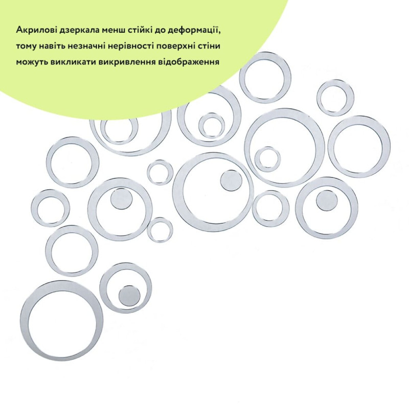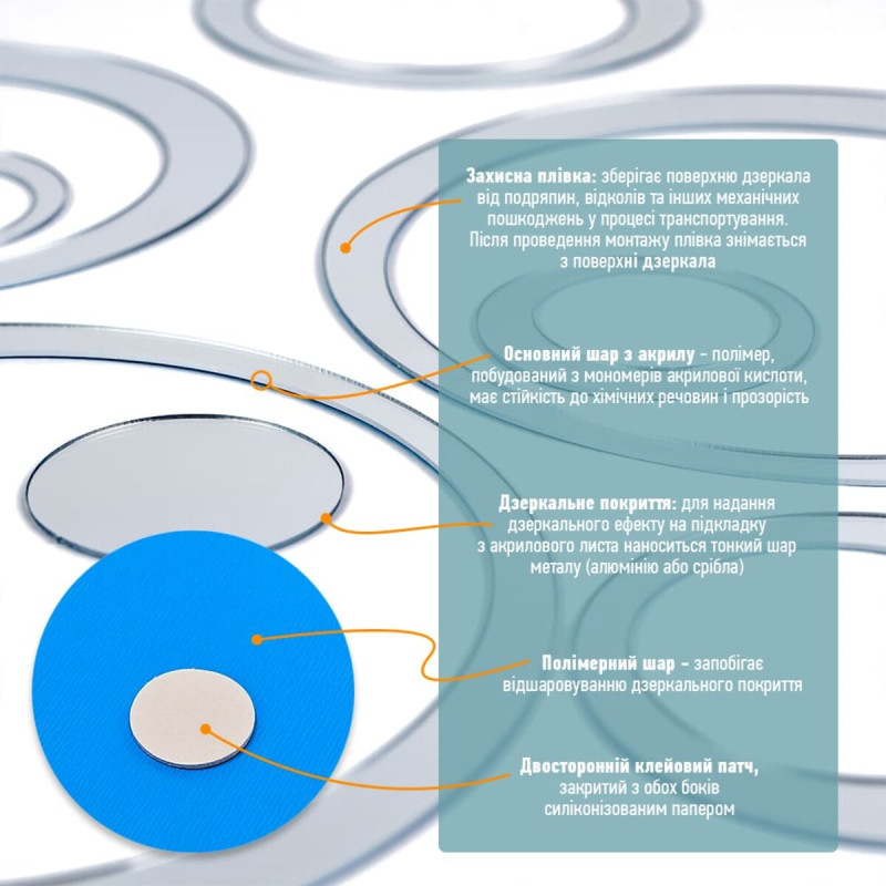 - Дзеркальний шар: це тонке металізоване або полімерне покриття, яке наноситься на акрилову основу та створює ефект дзеркального відбиття. Воно має гладку, світловідбивну поверхню, стійку до вологи та зношування. Завдяки гнучкості матеріалу відображення може незначно викривлюватися.