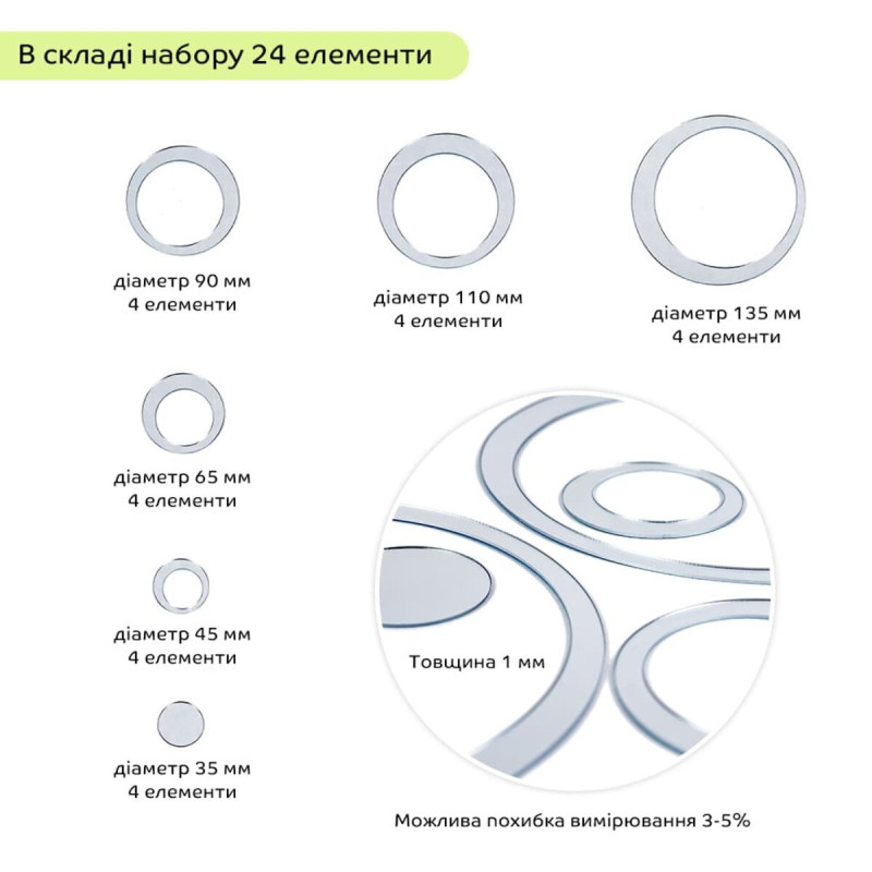 Розміри:24шт, товщина 1мм, D135мм - 4шт., D 110мм - 4шт., D 90мм - 4шт., D 65мм - 4шт., D 45мм - 4шт., D 35мм - 4шт,можлива похибка розміру 3-5%