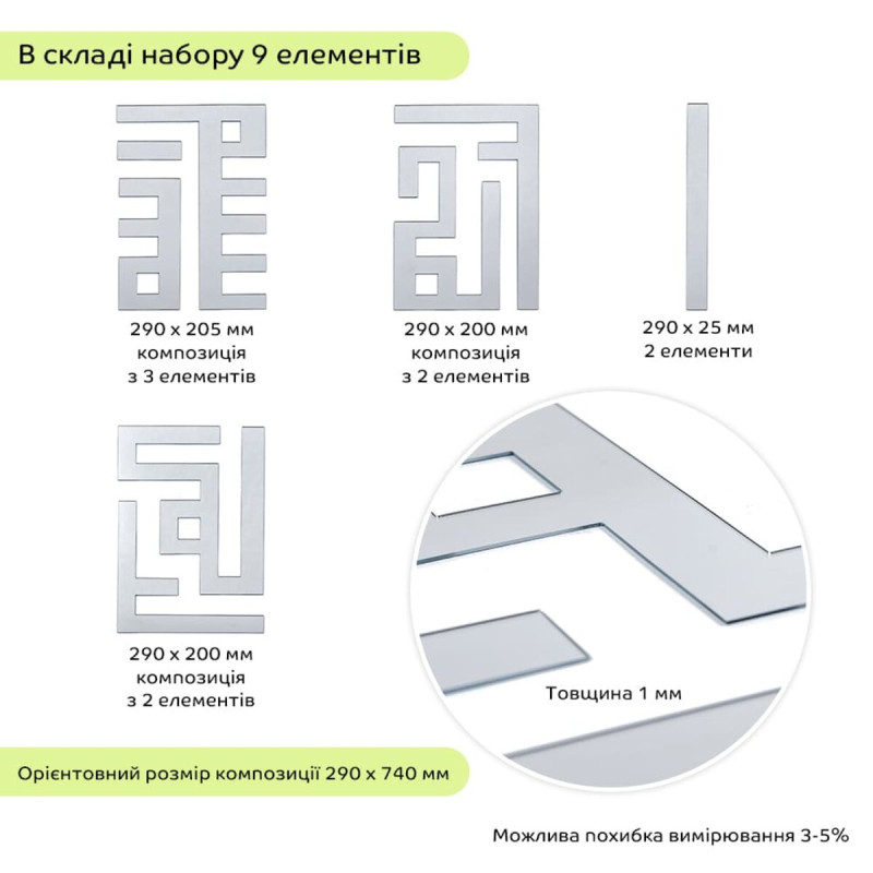 Розміри:9шт., товщина 1мм, композиція 290х740мм, можлива похибка розміру 3-5%