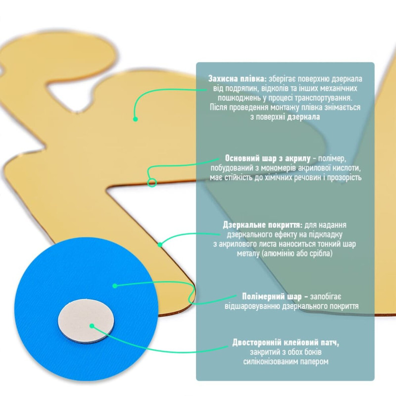 • Дзеркальний шар: це тонке металізоване або полімерне покриття, яке наноситься на акрилову основу та створює ефект дзеркального відбиття. Воно має гладку, світловідбивну поверхню, стійку до вологи та зношування. Завдяки гнучкості матеріалу відображення може незначно викривлюватися.