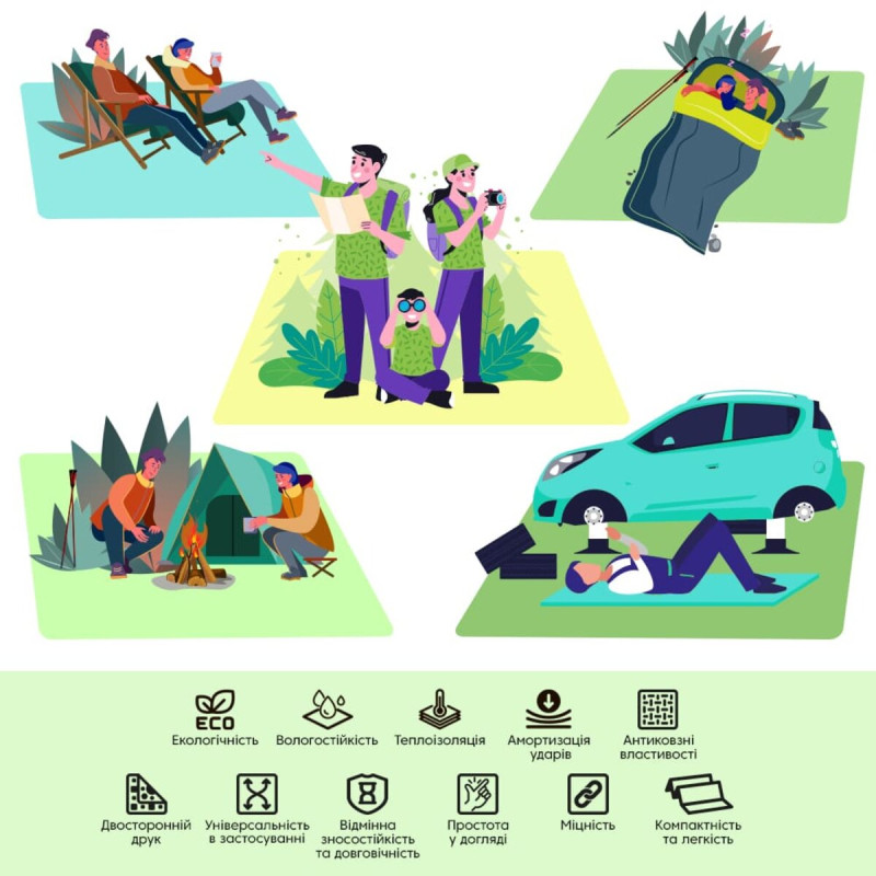 - Відпочинок на природі, мисливство та риболовля, туристичні заходи: вологостійкі термокилимки можна використовувати для створення комфортного покриття на пляжі, у лісі або у інших природних майданчиках.