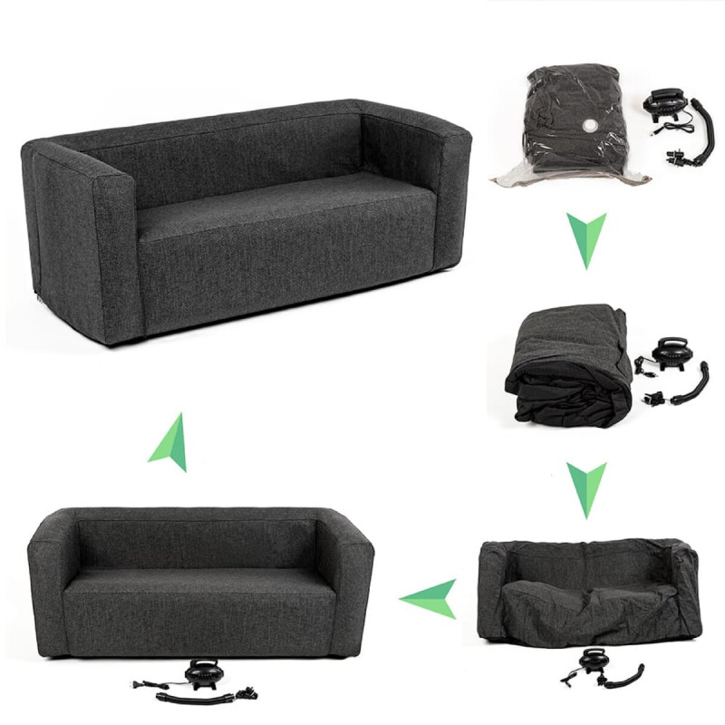 Зберігання: Після використання надувні меблі потрібно здути для зручності зберігання. Зберігайте меблі в сухому, добре провітрюваному приміщенні. Для додаткового захисту від пилу та пошкоджень помістіть меблі в компресійний пакет.