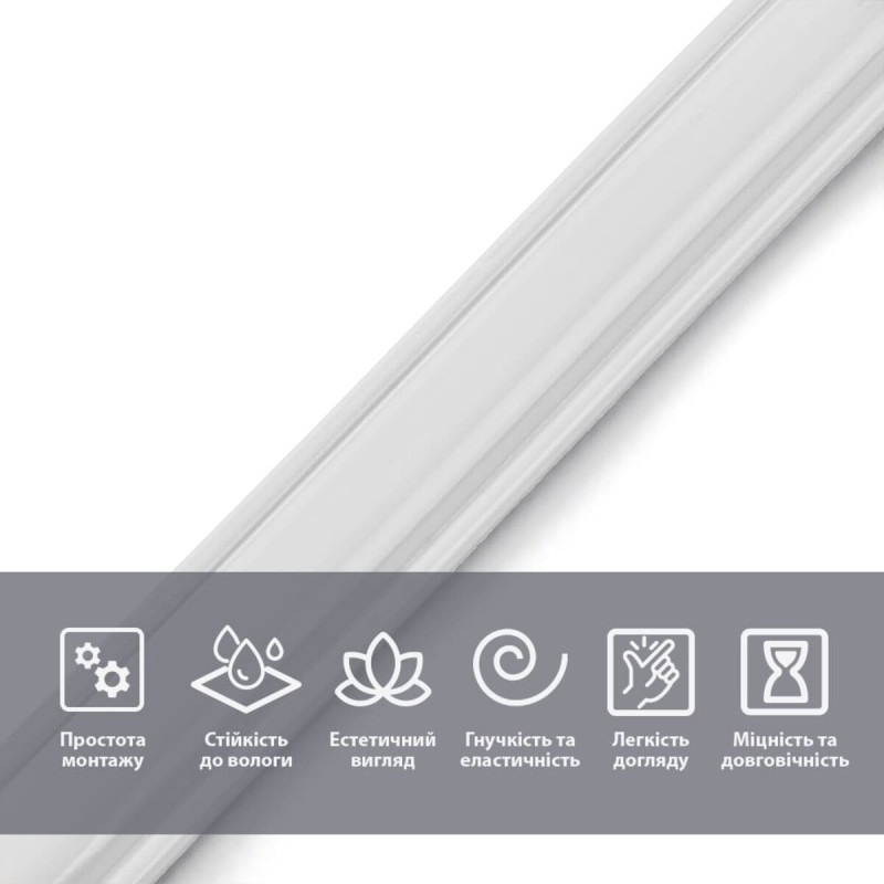 Гнучкість та еластичність: завдяки високій гнучкості молдинг щільно повторює контури навіть вигнутих або нерівних поверхонь, не утворюючи складок чи тріщин.