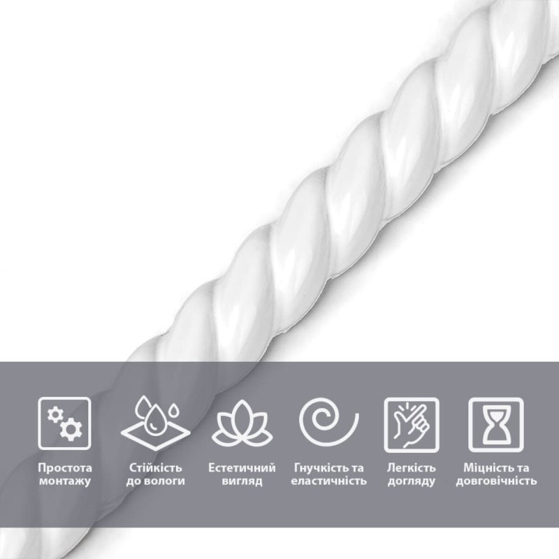 • Гнучкість та еластичність: завдяки високій гнучкості молдинг щільно повторює контури навіть вигнутих або нерівних поверхонь, не утворюючи складок чи тріщин.