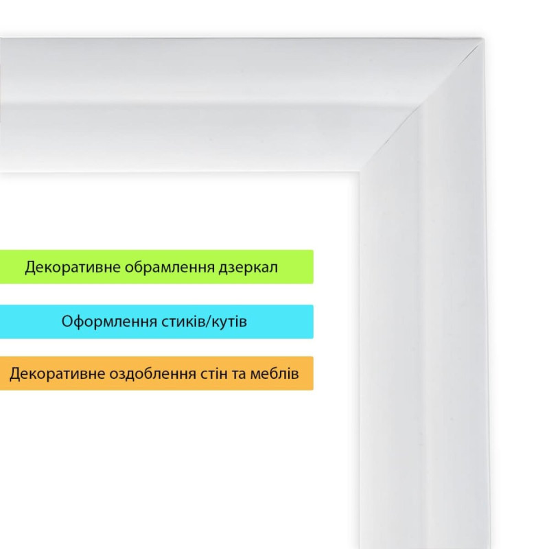 • Естетичний вигляд: гладка поверхня та чіткі лінії надають інтер’єру акуратності і завершеності. Доступність у кількох універсальних кольорах дозволяє легко підібрати молдинг під будь-який дизайн.