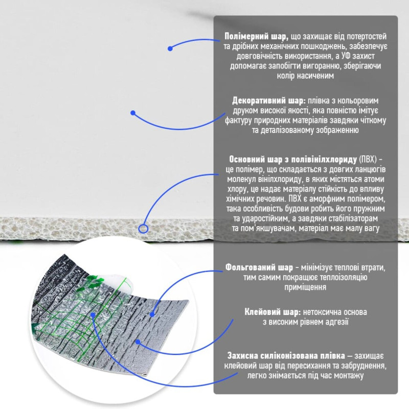 - Декоративний шар: плівка з кольоровим друком високої якості, яка повністю імітує фактуру природних матеріалів завдяки чіткому та деталізованому зображенню.