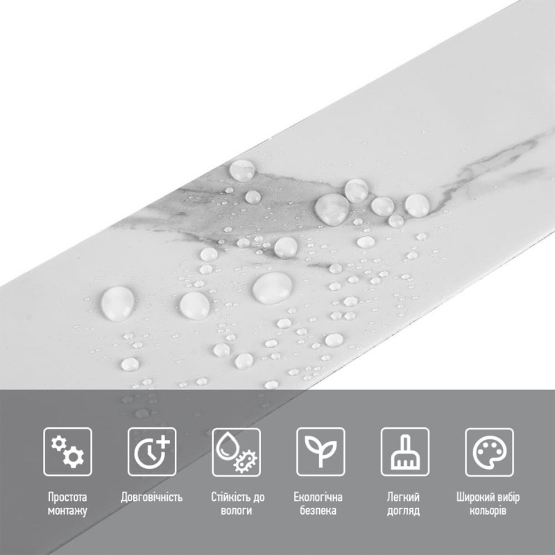 - Стійкість до вологи: вінілові молдінги стійкі до вологи, що робить їх відмінним вибором для ванних кімнат, кухонь та інших приміщень з підвищеною вологістю, матеріал стійкий також до впливу пари, а також до появи плісняви. Молдинг підходить для створення фартуха кухні, можна клеїти біля плити на відстані не менше ніж 30-50 см;
