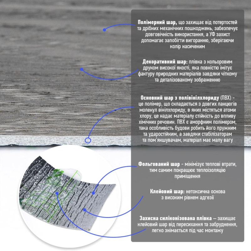- Декоративний шар: плівка з кольоровим друком високої якості, яка повністю імітує фактуру природних матеріалів завдяки чіткому та деталізованому зображенню.