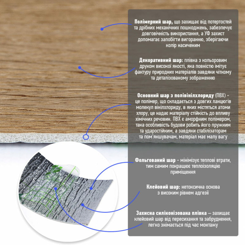 - Основний шар з полівінілхлориду (ПВХ) - це полімер, що складається з довгих ланцюгів молекул вінілхлориду, в яких містяться атоми хлору, це надає матеріалу стійкість до впливу хімічних речовин. ПВХ є аморфним полімером, така особливість будови робить його пружним та ударостійким, а завдяки стабілізаторам та пом'якшувачам, матеріал має малу вагу.