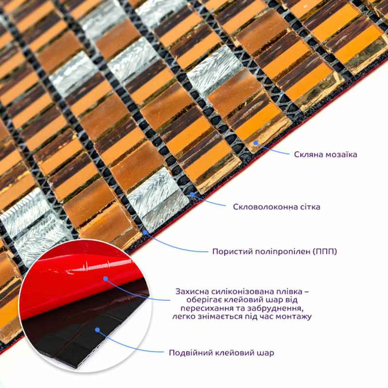 • Легкий монтаж: Завдяки самоклеючій основі мозаїку легко встановити на будь-яку рівну поверхню без потреби у спеціальних інструментах. Міцна фіксація забезпечує стійке кріплення, що дозволяє уникнути переміщення фрагментів при монтажі.