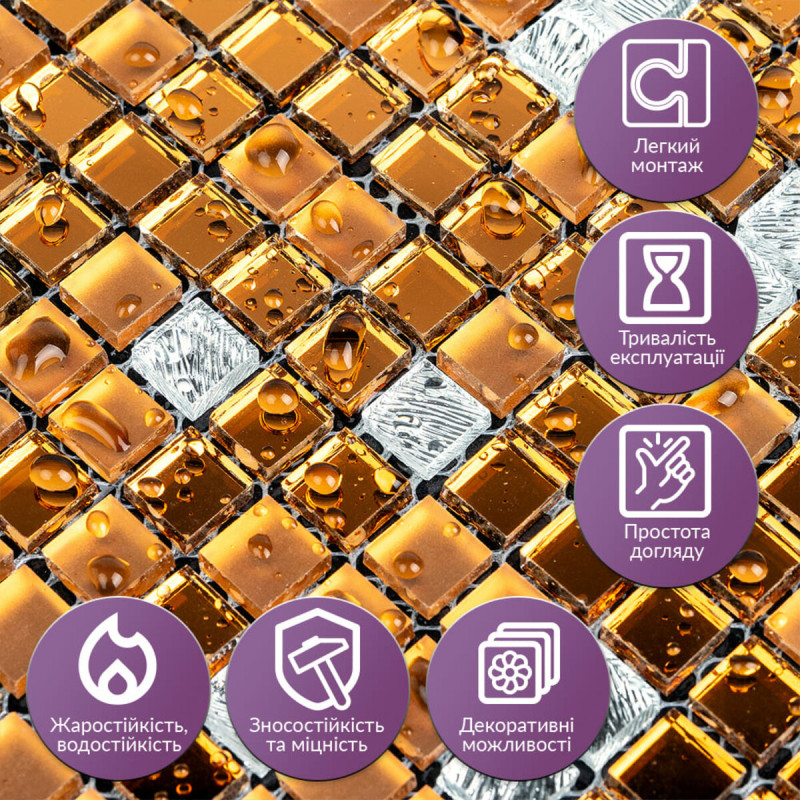 • Простота догляду: Мозаїка легко миється і не потребує спеціальних засобів для очищення, що спрощує її підтримання у належному стані. Вона не вбирає бруд і залишається чистою навіть у приміщеннях з високою вологістю та частим використанням.
