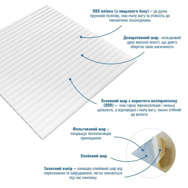 - Легкість монтажу: наявність клейового шару дозволяє встановити панелі без необхідності застосування додаткових матеріалів.