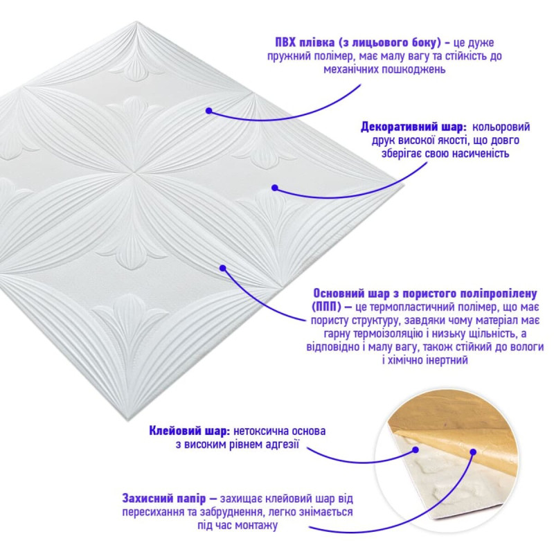- Легкість монтажу: наявність клейового шару дозволяє встановити панелі без необхідності застосування додаткових матеріалів.