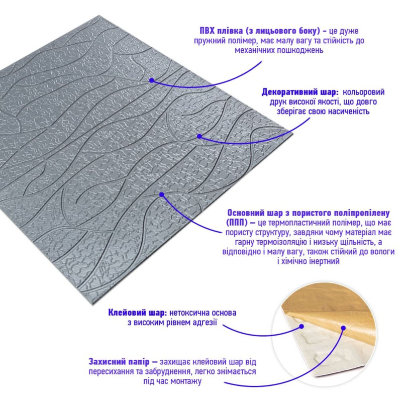 3. Легкість монтажу: наявність клейового шару дозволяє встановити панелі без необхідності застосування додаткових матеріалів.