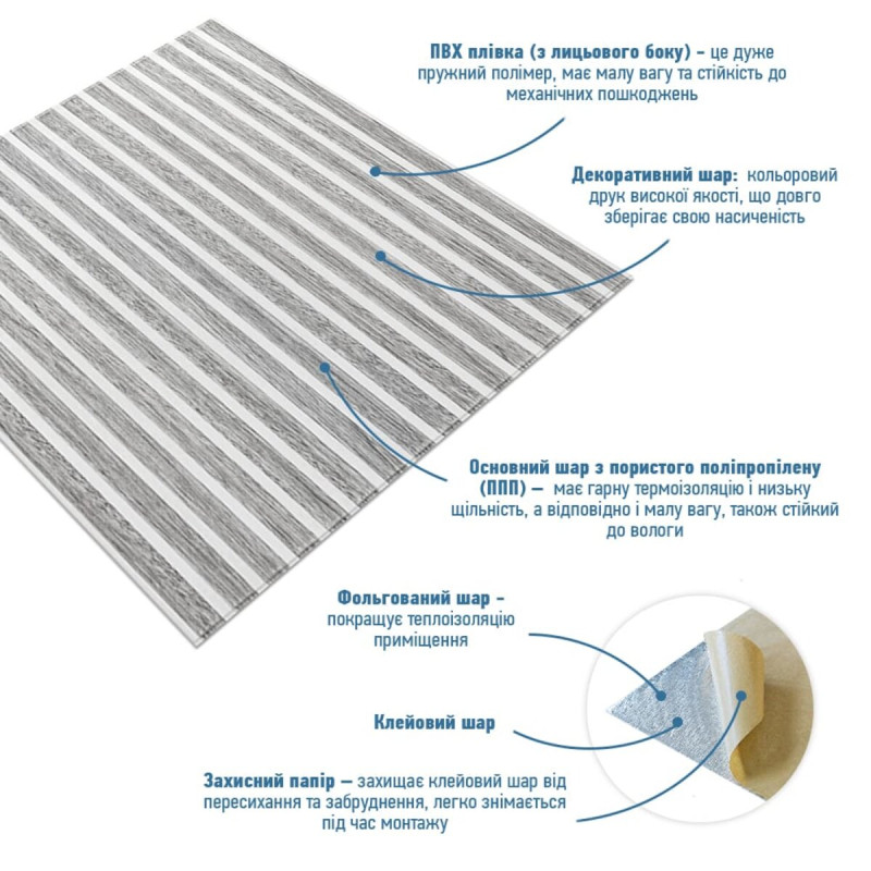 - Легкість монтажу: наявність клейового шару дозволяє встановити панелі без необхідності застосування додаткових матеріалів.