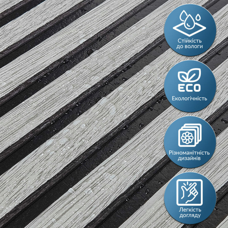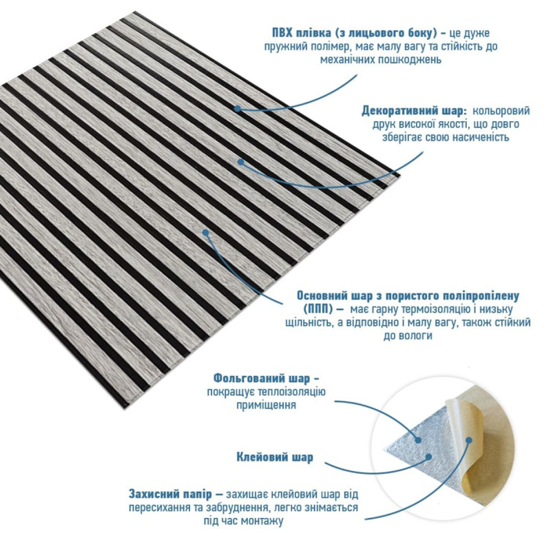 - Легкість монтажу: наявність клейового шару дозволяє встановити панелі без необхідності застосування додаткових матеріалів.