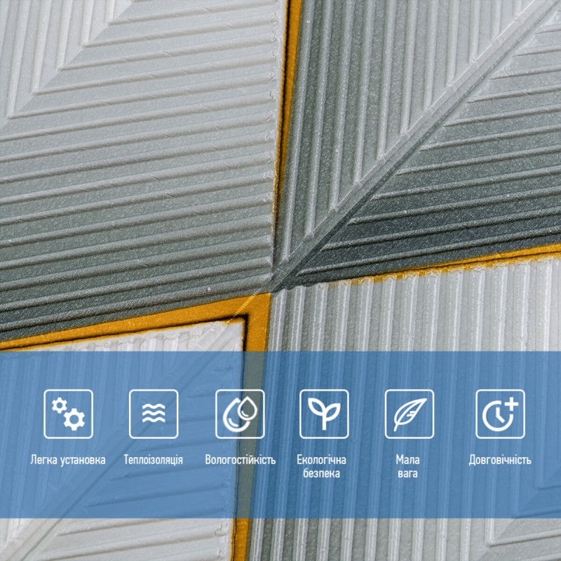 - Легкість монтажу: наявність клейового шару дозволяє встановити панелі без необхідності застосування додаткових матеріалів.