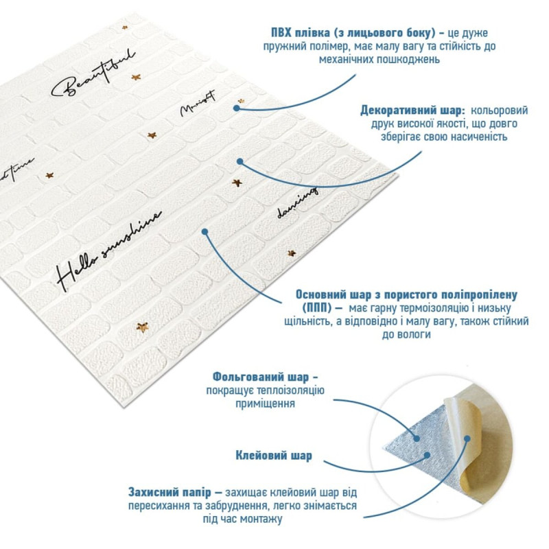 - Легкість монтажу: наявність клейового шару дозволяє встановити панелі без необхідності застосування додаткових матеріалів.