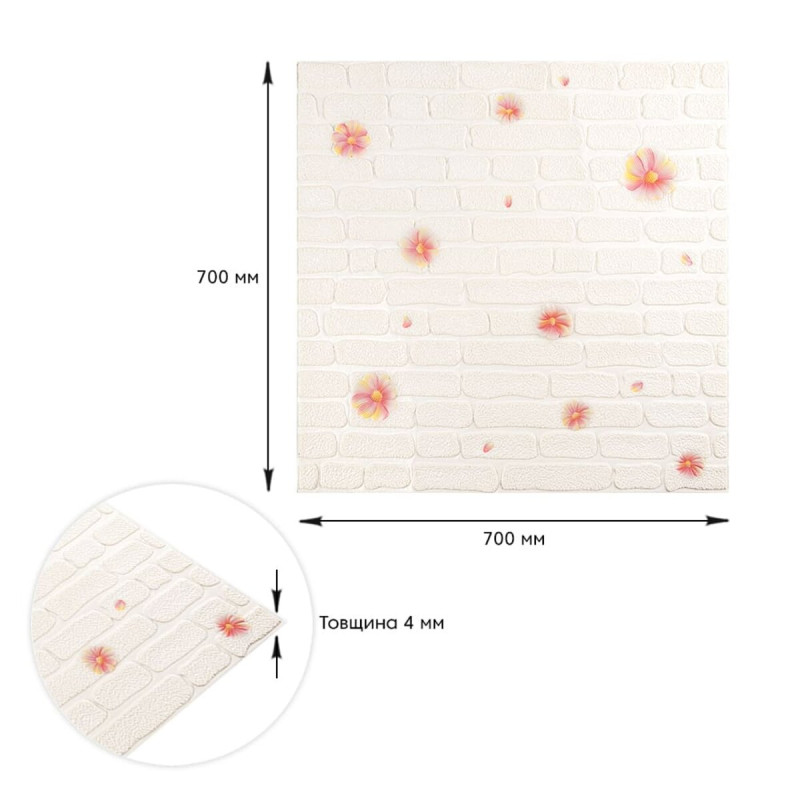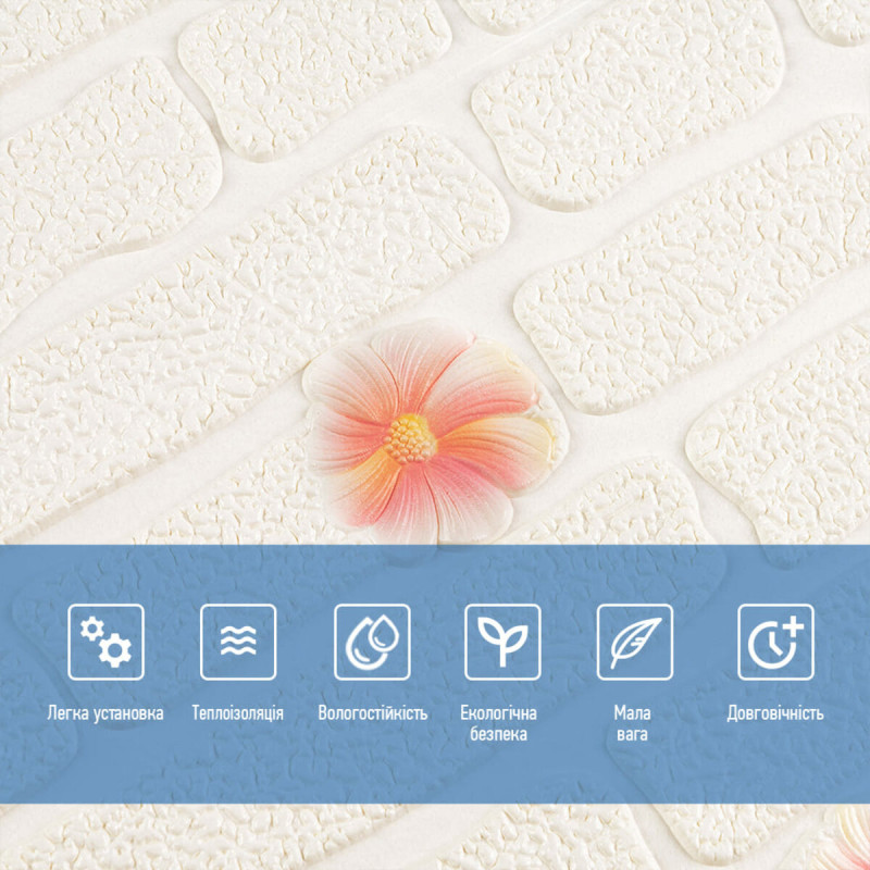 3D панелі самоклеючі – декоративне покриття для стін, виконане з легкого та міцного матеріалу – пористого поліпропілену (ППП). Основна особливість – рельєфний малюнок у вигляді цегли у широкому різноманітті кольорів та наявність клейового шару, що дозволяє встановити панелі без необхідності застосування додаткових матеріалів.