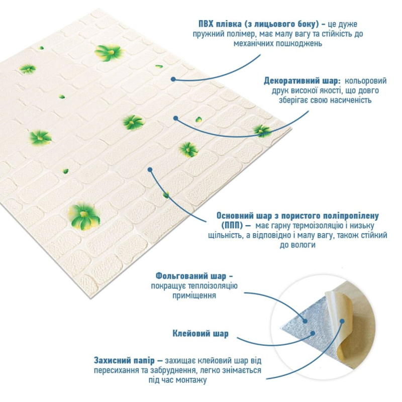 - Легкість монтажу: наявність клейового шару дозволяє встановити панелі без необхідності застосування додаткових матеріалів.