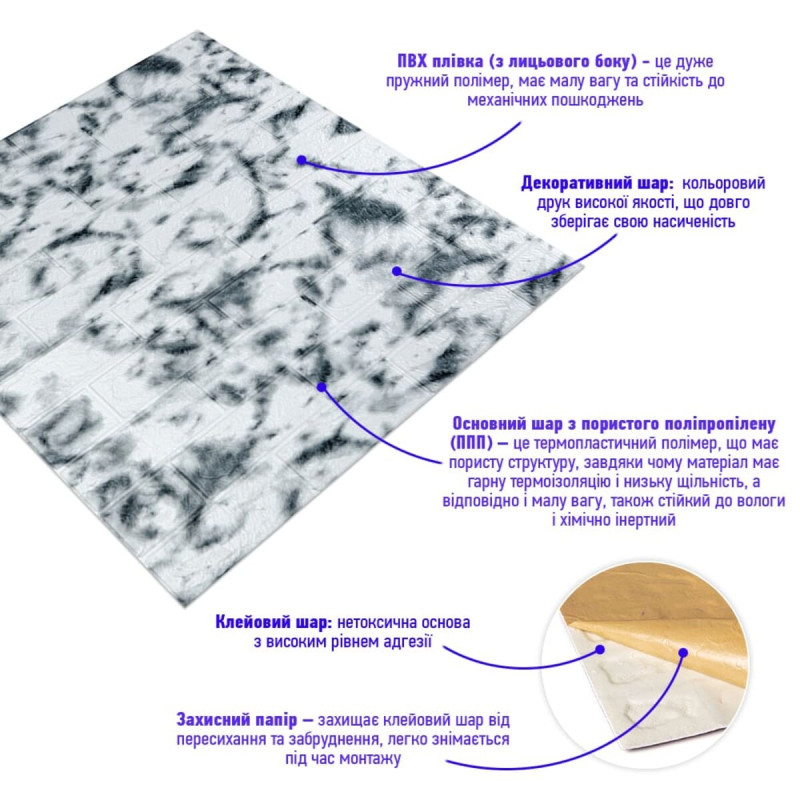 - Легкість монтажу: наявність клейового шару дозволяє встановити панелі без необхідності застосування додаткових матеріалів.