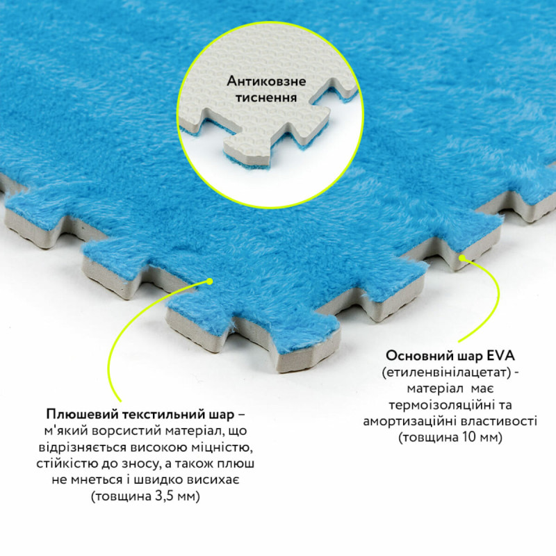 • Антиковзні властивості. На зворотному боці плюшевих пазлів є спеціальне тиснення, що забезпечує надійну фіксацію на підлозі і запобігає ковзанню під час використання.
