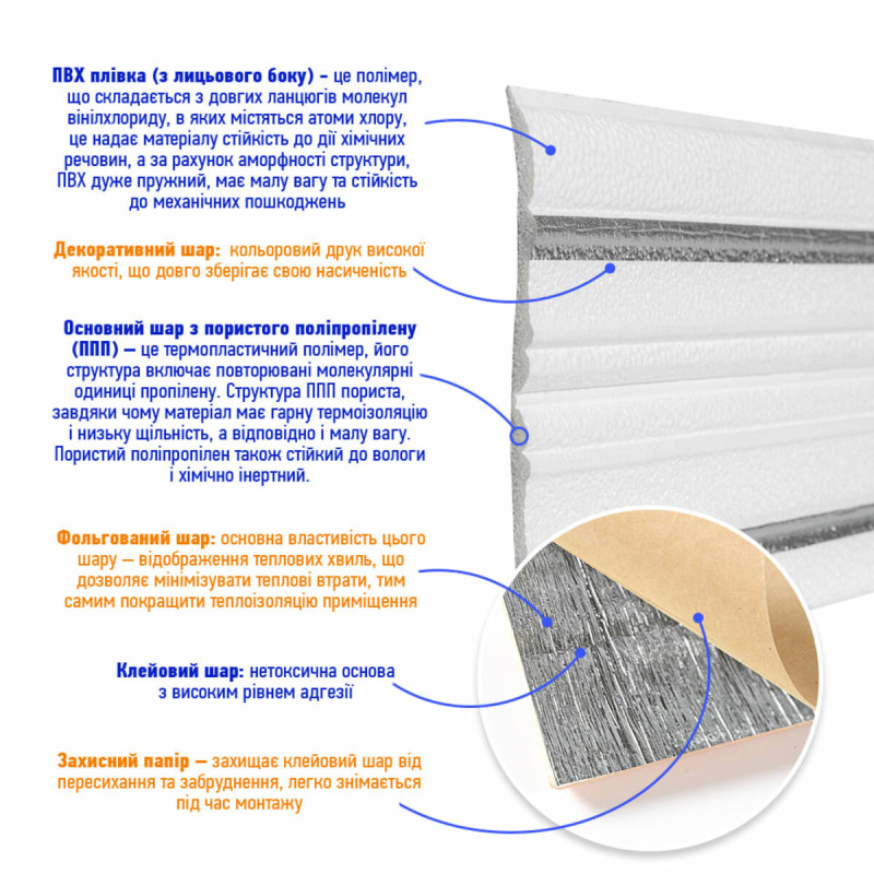 4. Фольгований шар: основна властивість цього шару – відображення теплових хвиль, що дозволяє мінімізувати теплові втрати, тим самим покращити теплоізоляцію приміщення.