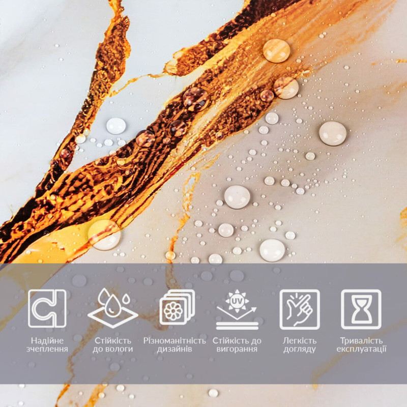 • Вологостійкість: завдяки ламінації, плівка має підвищену стійкість до вологи, що робить її ідеальною для використання у приміщеннях з підвищеною вологістю, таких як кухня чи ванна кімната.