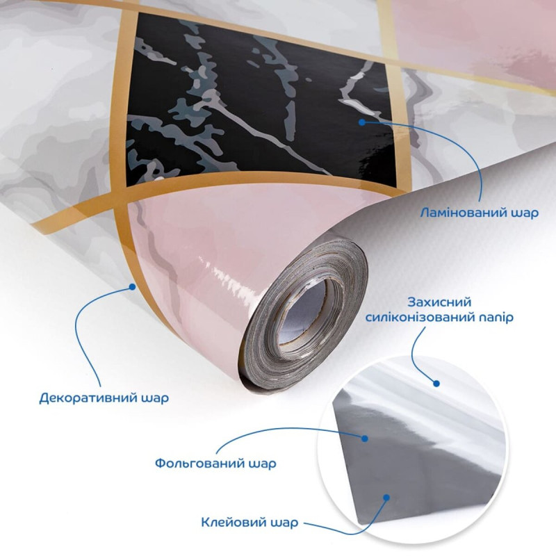 • Декоративний шар. Під ламінацією знаходиться шар з декоративним друком, на якому зображено малюнок або текстура, що імітують дерево, мармур, плитку чи інші матеріали. Цей шар надає плівці візуальну привабливість, що підходить для різноманітних інтер’єрних рішень.