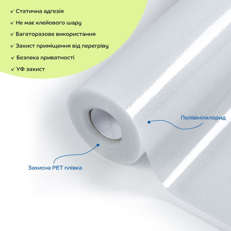 Віконна ПВХ плівка не має клейового шару та кріпиться за допомогою води, працює за принципом статичної адгезії. Це означає, що плівка тримається на поверхні вікна завдяки статичній електриці і щільному приляганню до скла. Вода допомагає забезпечити краще зчеплення між плівкою і склом, зменшуючи кількість бульбашок повітря під плівкою.