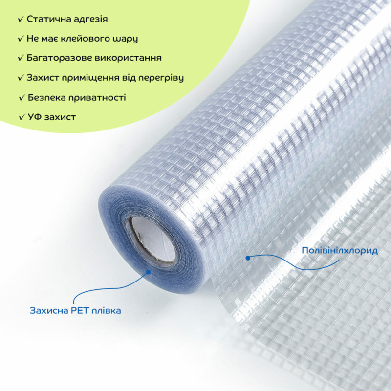 • Універсальність та легкість в монтажі: ПВХ плівки можна легко різати ножицями або монтажним ножем, що дозволяє використовувати їх у різних місцях: на вікнах, розсувних дверях, кухонних шафах та інших скляних поверхнях.