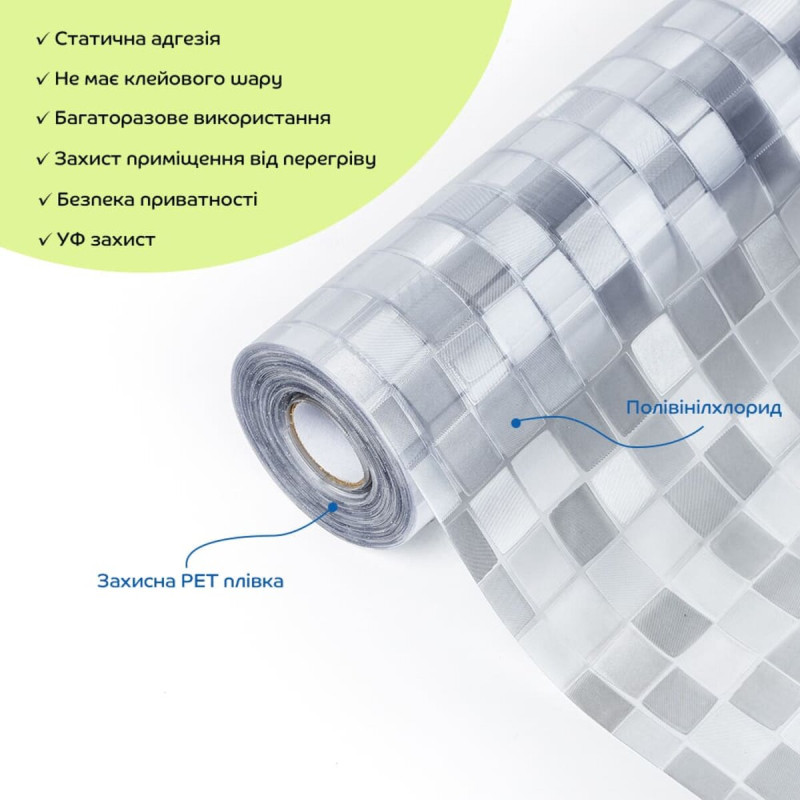 • Універсальність та легкість в монтажі: ПВХ плівки можна легко різати ножицями або монтажним ножем, що дозволяє використовувати їх у різних місцях: на вікнах, розсувних дверях, кухонних шафах та інших скляних поверхнях.