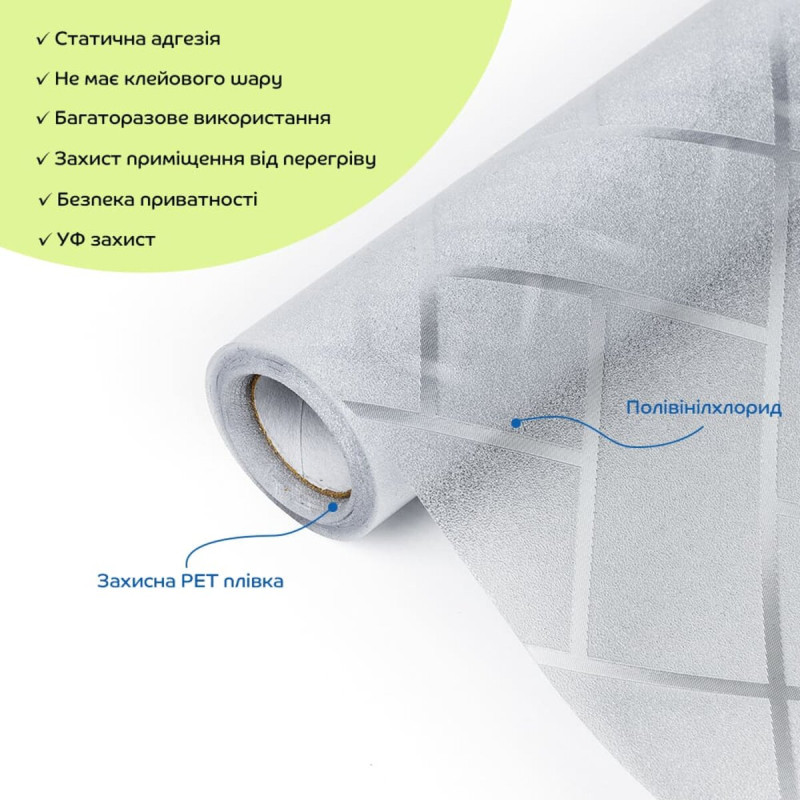 Віконна ПВХ-плівка – це декоративний матеріал, призначений для прикраси скляних поверхонь. Вона забезпечує приватність, захищає від ультрафіолетового випромінювання та додає естетичної привабливості вашому інтер'єру. Легко наноситься на будь-яке скло, перетворюючи його на непрозору поверхню та обмежуючи видимість через скло.