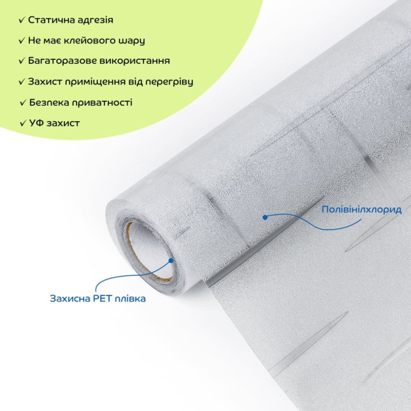 • Універсальність та легкість в монтажі: ПВХ плівки можна легко різати ножицями або монтажним ножем, що дозволяє використовувати їх у різних місцях: на вікнах, розсувних дверях, кухонних шафах та інших скляних поверхнях.